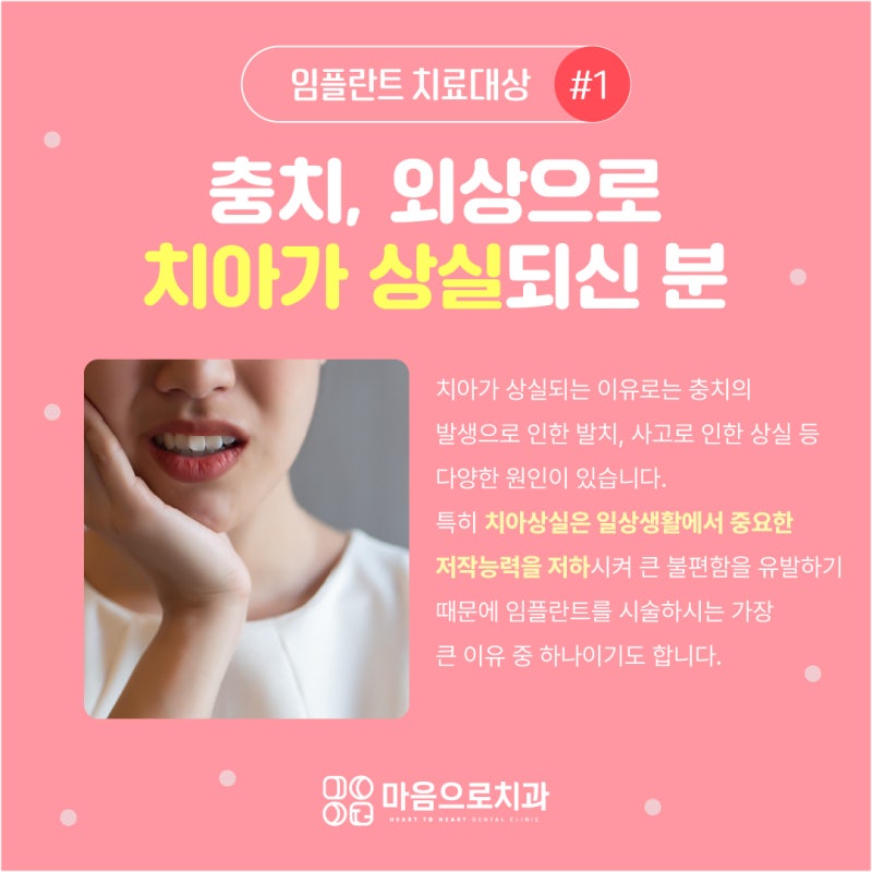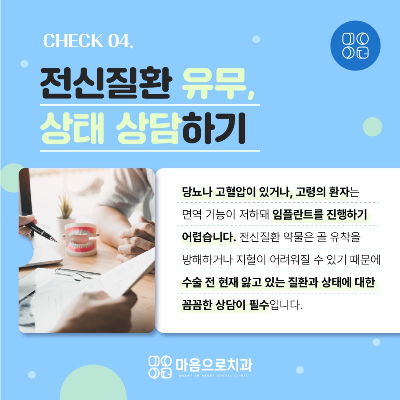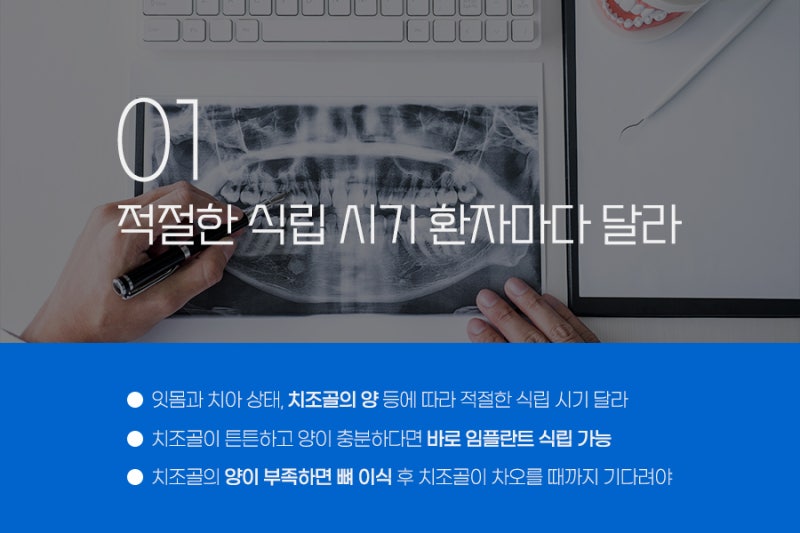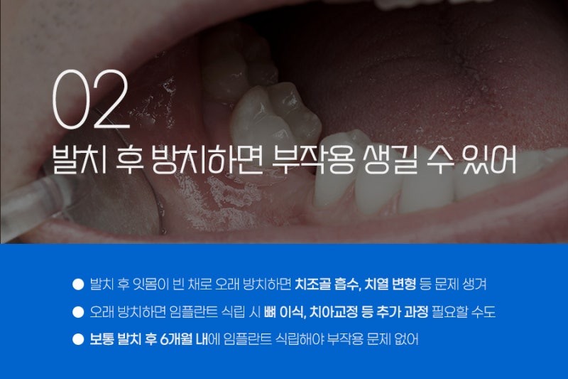 사실 나이보다 더 중요한 게 있어요. 바로 환자의 구강 상태입니다. 어떤 분들은 비교적 연령층이 낮음에도 불구하고 구강 상태가 굉장히 안 좋고 남아 있는 치조골의 양도 적어서 수술이 힘들어도 오래 걸릴 수 있습니다. 한편 어떤 분들은 연령층이 높은데 구강 상태가 좋고 남아있는 치조골의 양도 충분하기 때문에 발치 후 바로 임플란트를 심기도 합니다.그렇다면 어떤 경우에 구강 상태가 나빠지는 것일까요?여러 가지 요인이 있겠지만 평소에 양치질을 게을리 하시는 분들이나 담배를 많이 피우시는 분들은 아무래도 구강 건강이 나쁠 가능성이 높습니다. 또는 선천적으로 치아나 잇몸이 약한 분들도 있습니다.치통, 잇몸출혈 등의 증상이 있음에도 불구하고 치료를 받지 않고 오래 방치했던 분들이나 치아가 빠진 후 빈 상태로 오랫동안 있었던 분들도 구강 상태가 나쁜 경우가 많습니다.