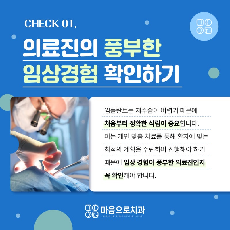 중요한 것은 전반적인 구강 상태를 파악하고 그에 맞게 계획을 세우고 치료를 진행하는 것입니다.한번 심으면 자연치아 대신 오랜 기간 사용할 수 있어야 하므로 신중하게 알아보고 신뢰할 수 있는 곳에서 해야 합니다.임플란트는 치과 치료 중에서도 쉽지 않은 고난도 치료라고 할 수 있습니다. 잇몸 염증, 치조골 상태, 교합 등 여러 가지를 고려해 수술을 해야 하는 만큼 많은 변수가 있을 수 있기 때문입니다. 따라서 비용만 계산하기보다는 의료진의 실력과 경험, 장비, 사후관리 등을 꼼꼼히 살펴본 후 치료를 받아야 합니다. 또한 가급적 대표원장이 진단부터 수술까지 직접 하는 대구 중구 치과를 선택하는 것이 좋습니다.