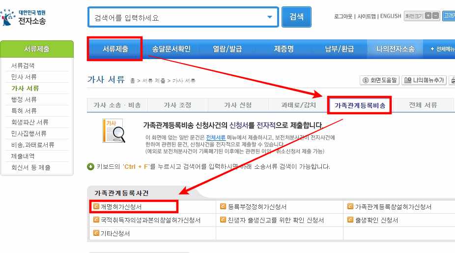 그런 다음 여기 검색창에서 개명을 검색한 후 아래에 보이는 개명 허가 신청서 클릭