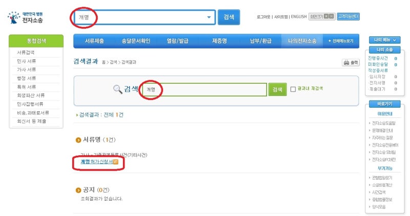 그런 다음 여기 검색창에서 개명을 검색한 후 아래에 보이는 개명 허가 신청서 클릭