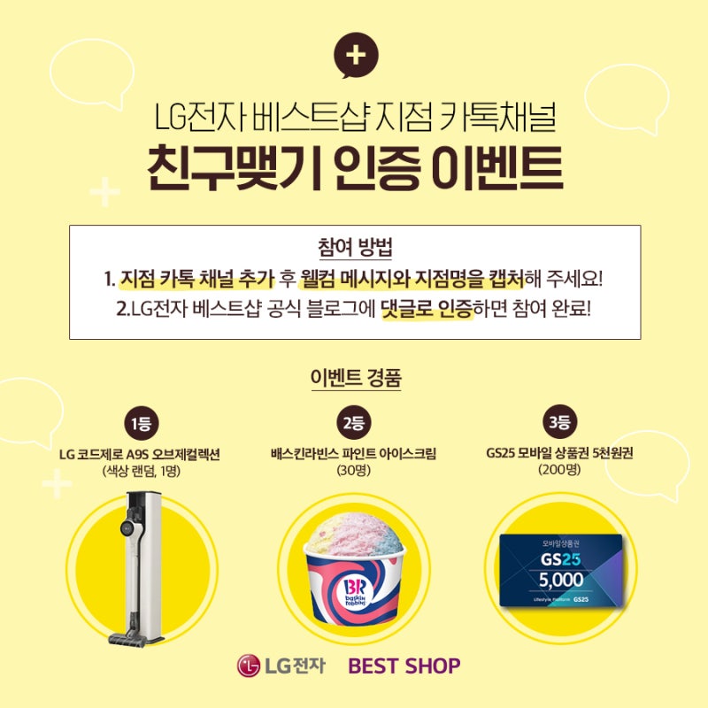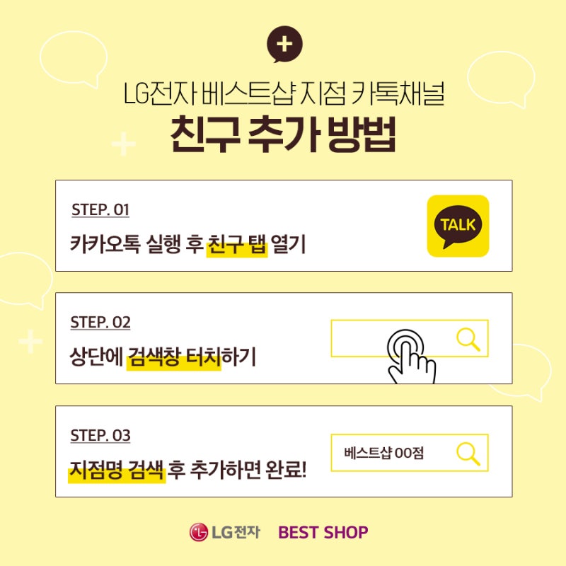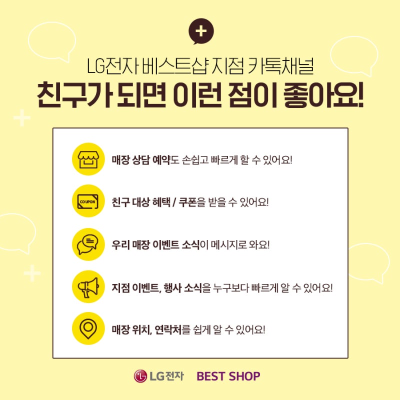 LG전자 베스트샵 카카오톡 친구를 추가해 빠른 소식과 혜택은 물론 든든한 선물까지 받아갑니다. LG전자 베스트샵 카카오톡 채널 친구추가하기