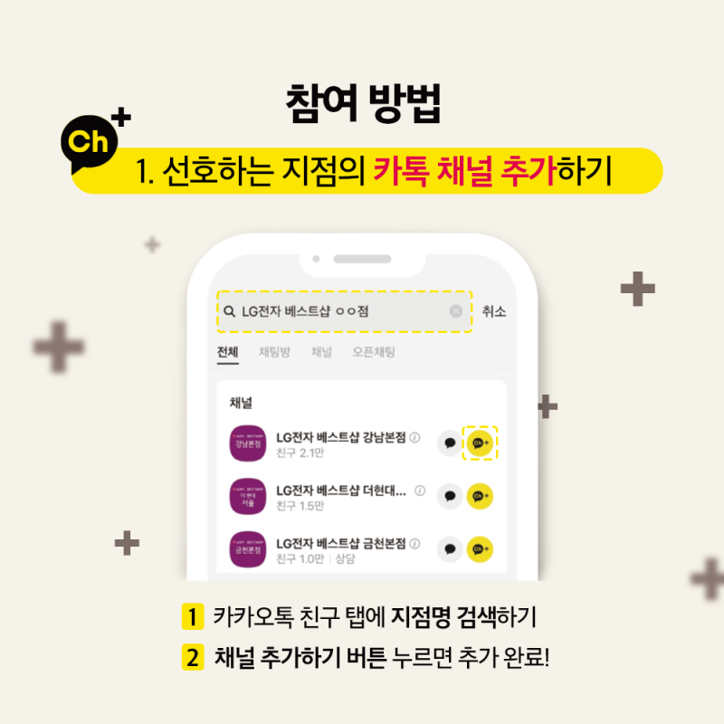 듣기만 해도 군침 도는 선물이 가득한 카카오톡 슬롯 이벤트 참여 방법을 알려드릴게요!안내드리는 방법을 그대로 따라오시면 하나도 어렵지 않아요 STEP 1 카카오톡에 들어가셔서 LG BEST SHOP(공식) or LG전자 베스트샵 00점(지점) 검색 후 카카오톡 채널 친구추가 버튼 누르실게요! 카카오톡 친구가 추가되어야 이벤트에 참여할 수 있으니 꼭 잊지 마세요!LG전자 베스트샵 카카오톡 채널과 친구가 되면 좋은 점이 뭐냐고요? 스마트 가전 구매 혜택부터 이벤트, 최신 가전 정보, 라이브 방송 등 다양한 정보를 보내드립니다 가전 구매를 고려하고 계신 분이라면 반드시 채널을 추가해야겠죠? LG전자 베스트샵 카카오톡 채널 친구추가