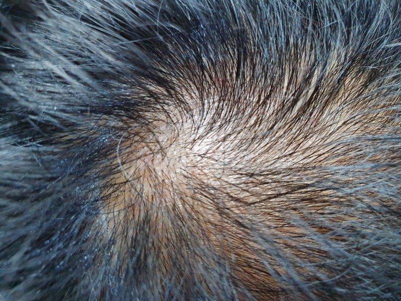 SMP의 두피 타투 효과 전후인데 왼쪽이 그 다음이고, 동그라미를 자세히 보면 20개 정도의 점을 찍은 후 찍은 점들이 눈에 잘 띄도록 볼 수 있고, 일정한 간격, 수압, 그라데이션 등의 기법으로 모발을 채워주는 방법이기 때문에 탈모에 지장이 없습니다